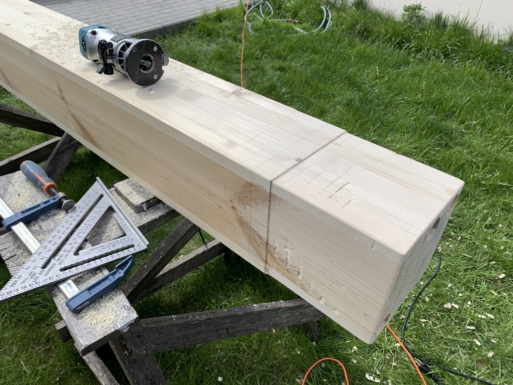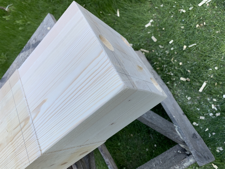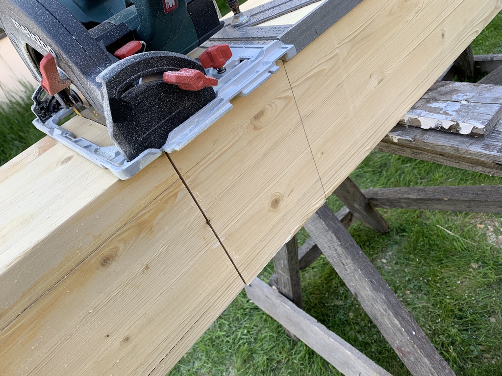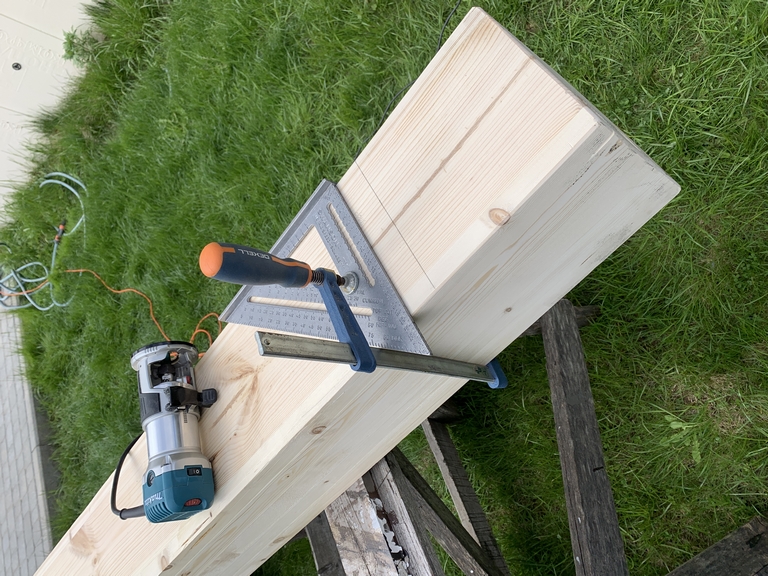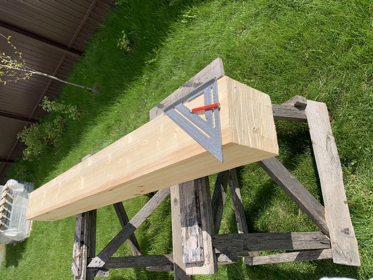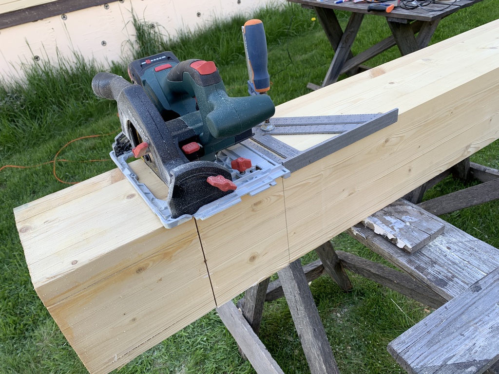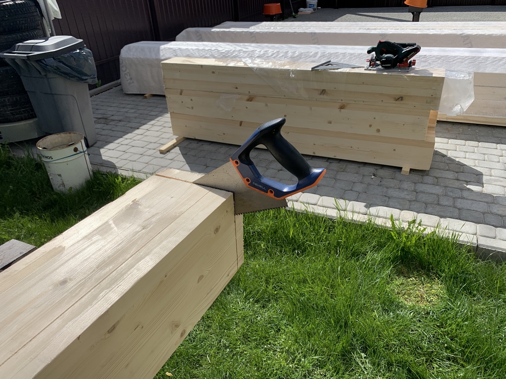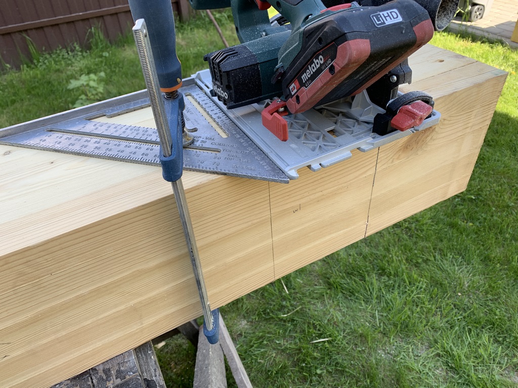 32. 09 мая 23 года. С железом покончено, приступаем к дереву. Начинаем со столбов. Торцуем нижнюю часть.
