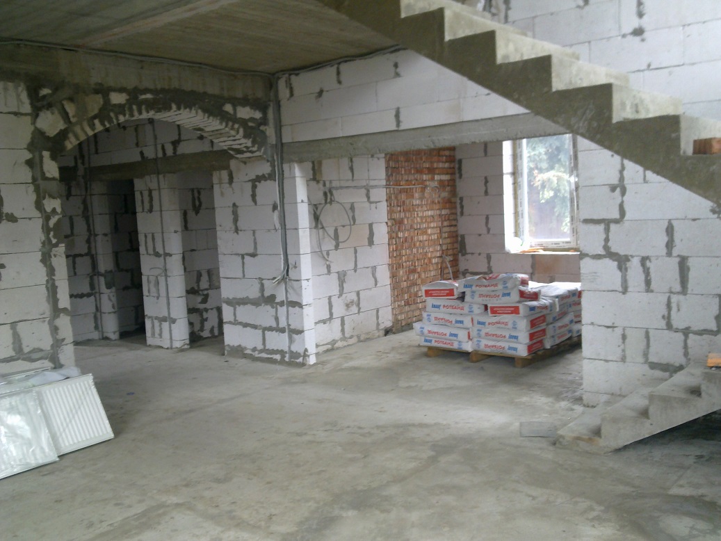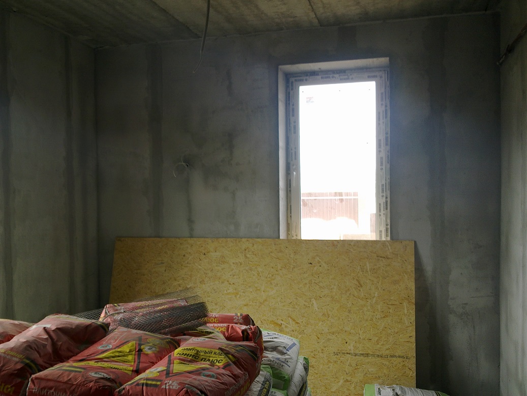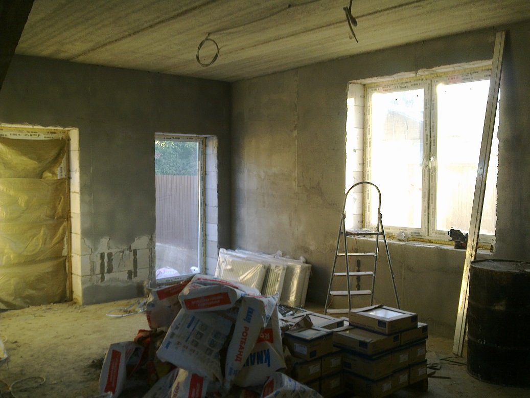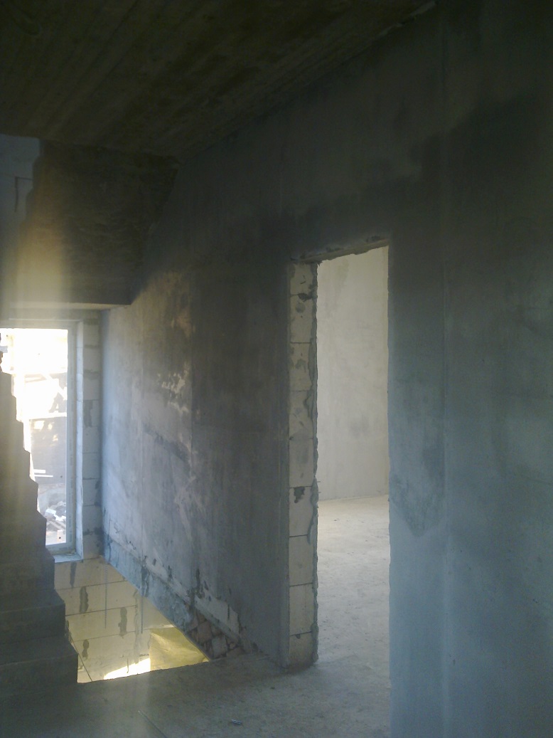"щикатурим" везде. У меня 100500 фоток этого процесса по всем комнатам, еще пару запощу и на этом с "черновой" штукатуркой закончим. Для сравнения скажу, у соседа узбеки потратили больше 500 мешков на это (хотя я думаю, часть они налево пустили, пользуясь тем, что сосед раз в неделю приезжал), у меня менее 230. Это большой плюс конкретных гб блоков и каменщиков, уложили достаточно хорошо, слой штукатурки максимальный был не более 1,5 см. Предварительно, естественно, все стены обрабатывались для улучшения адгезии. на этом этапе я сэкономил маленько, покупал Снежинку.