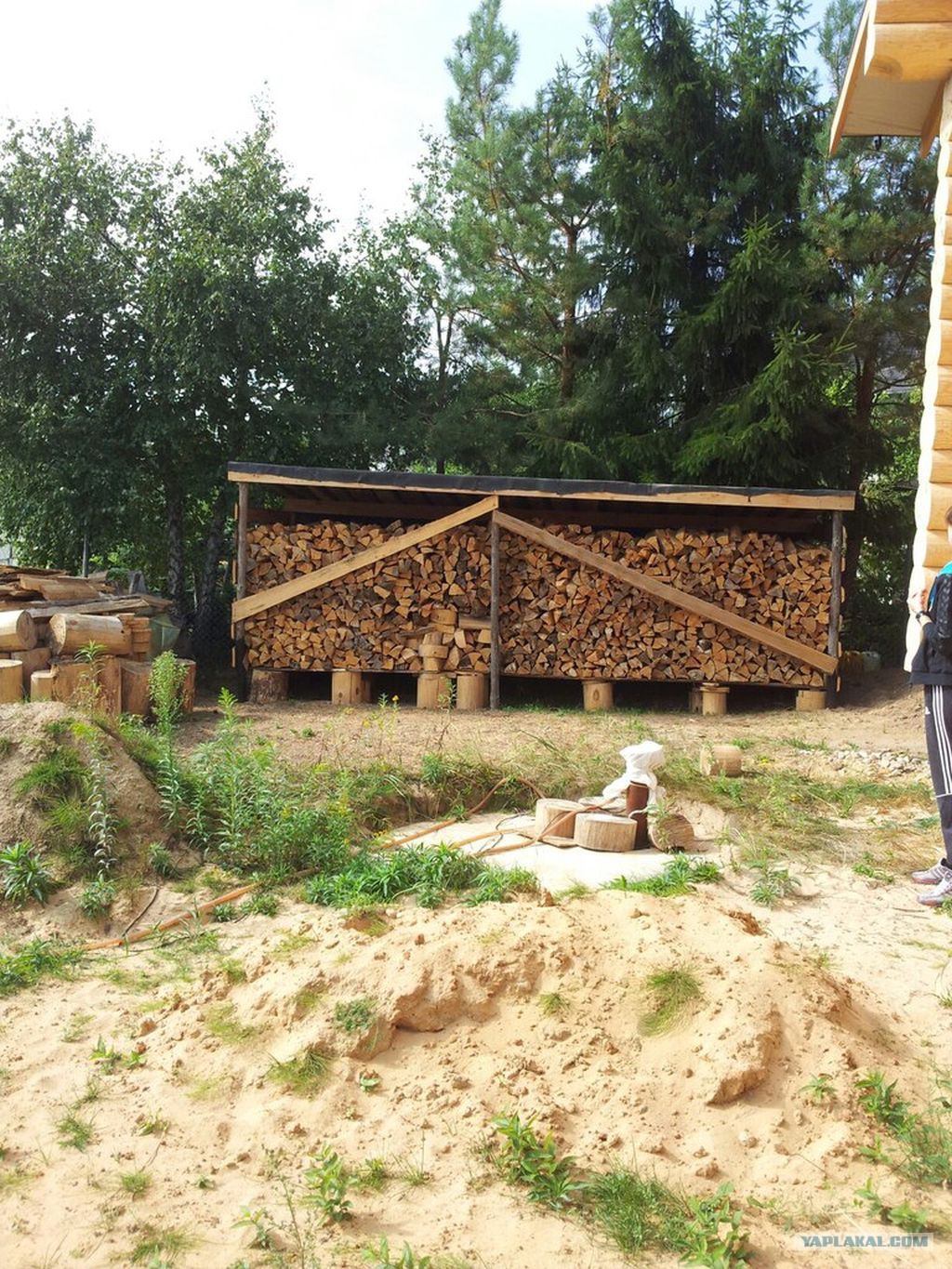 Была огромная куча отходов-обрезков. На фото выше есть она. Теперь там поленница.