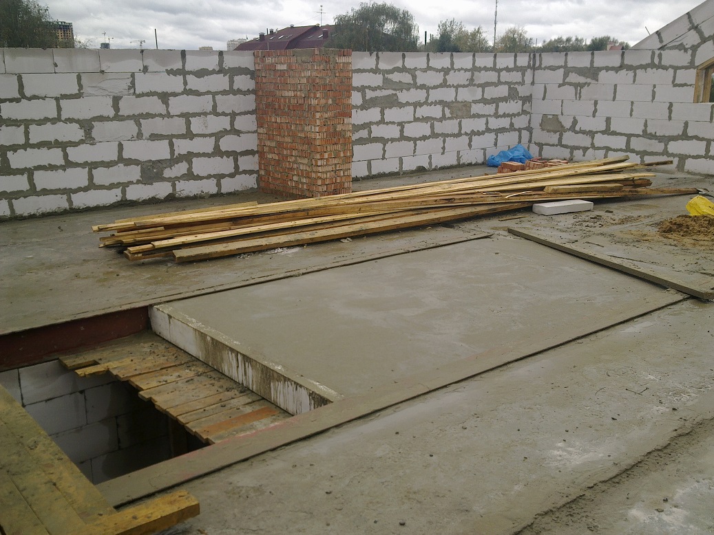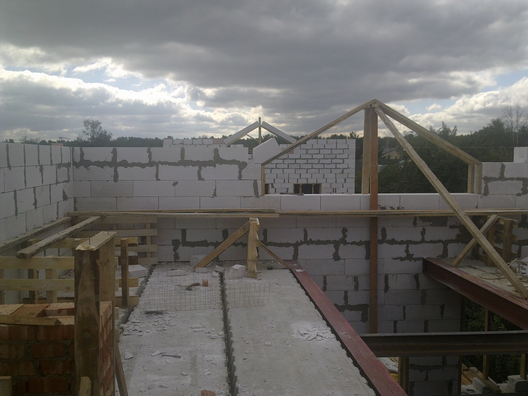 вид на соседа, он решил делать двускатную крышу, а я - по проекту, но вопреки проекта, я попросил пересчитать мне нагрузки и связки для того, чтоб убрать все столбы внутри третьего этажа, чтоб это было одно открытое пространство