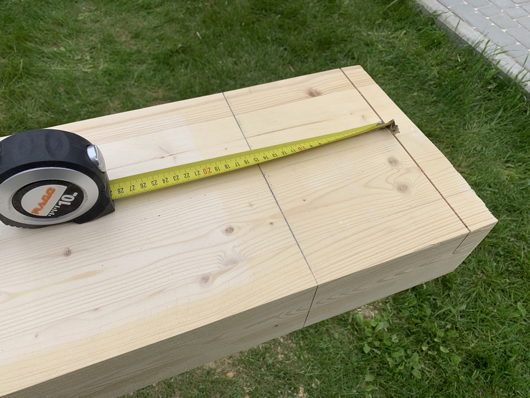 60. 20 мая 2023 года. Размечаю 6.80 м. и обрезаю. Так как брус 250х100, торцевал циркуляркой с двух сторон, перевернув брус.