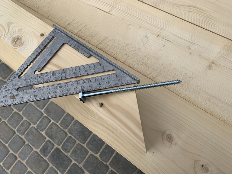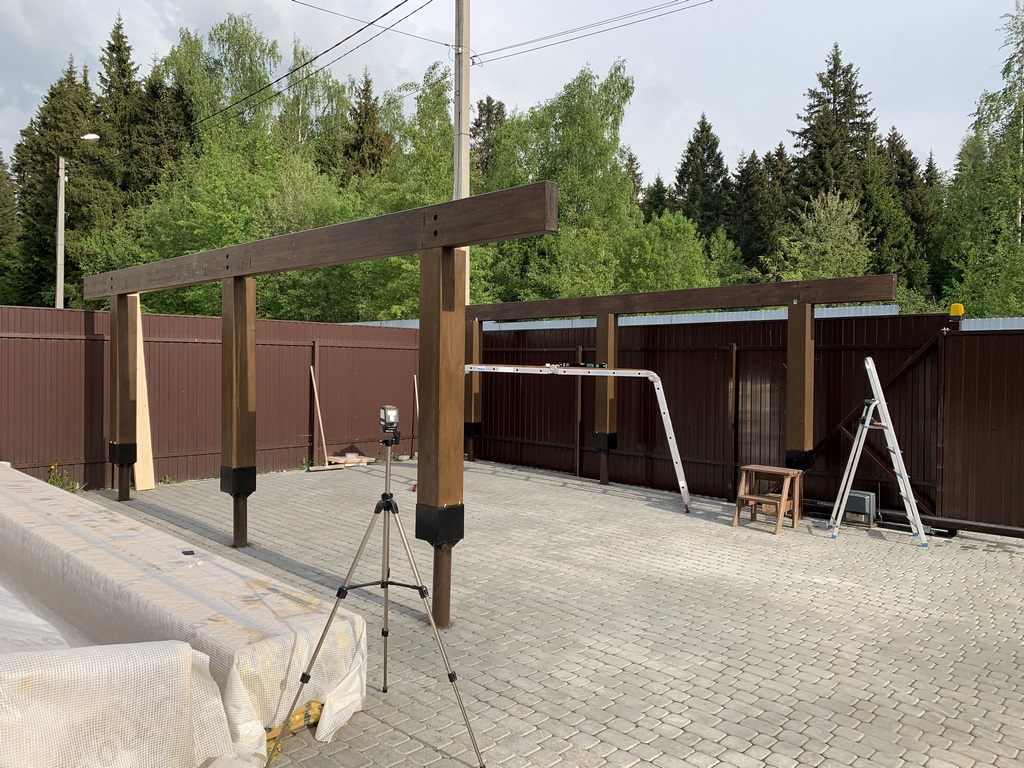 54. 17 мая 23 года. Продолжаем. Нижнюю часть столбов обработал резино-битумной мастикой. Оставил на сутки на высыхание. Потом покрасил и установил их на места. Фото не сделал. Что хочу отметить, столбы я не крепил в стаканах до последнего момента. То есть они у меня просто стояли, распертые клиньями для плитки. Чтобы можно было их немного регулировать при выставлении верхней обвязки навеса. Закрепил я столбы уже после установки мауэрлата.