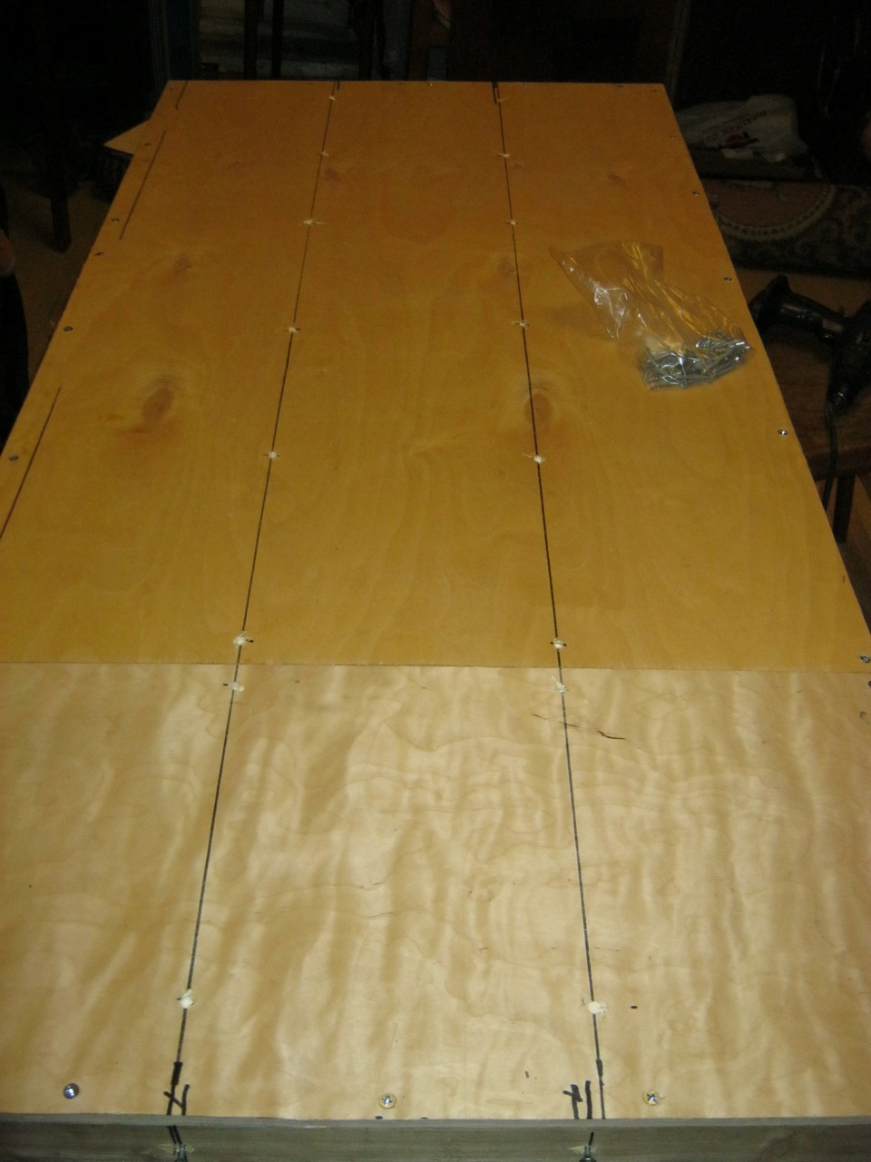 Крепим к нему фанеру на клей и шурупы.