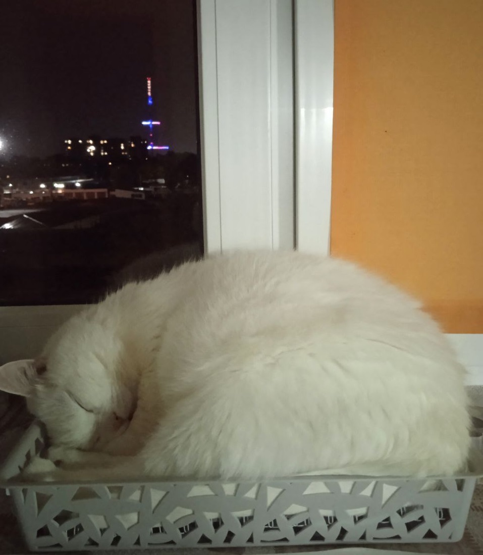 Этот беломордый любит сидеть на окне и смотреть вниз, на вечернюю пробку, а потом идти спать в контейнер, который покупался под всякие блокноты и тетрадки, но кот решил, что ему нужнее. =)