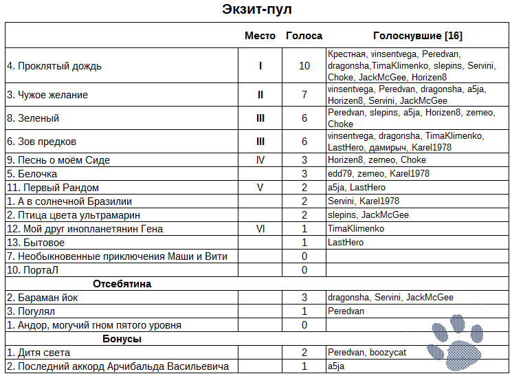 В "местной" таблице голосов по нулям осталось у Маши-Вити и у гнома Андора из Отсебятины (а за него точно никто не голосовал?) upset.gif