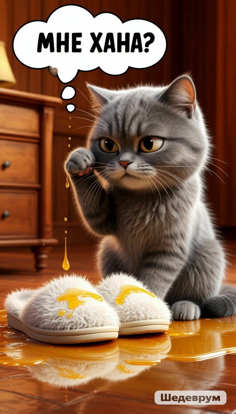 Полчаса назад написавший в этот самый тапок котейка ехидно ухмыльнулся и спрятался под шкаф