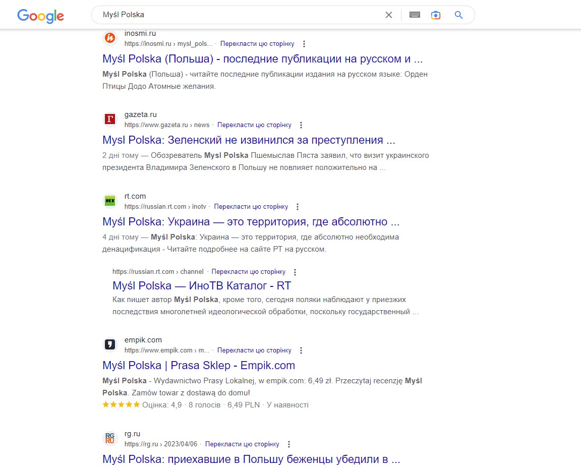 Myśl Polska в Польше считают нишевым изданием националистической направленности. Myśl Polska зачастую поддерживает позицию России, а среди авторов издания можно, например, увидеть Матеуша Пискорского. Он поддержал аннексию Крыма и даже был наблюдателем на так называемом референдуме. Подозревался Агентством национальной безопасности Польши в сотрудничестве с российской разведкой и продвижении российских интересов. Это издание с удовольствием ретранслирует российские нарративы. Например, среди материалов – «Сирия признает народные республики», «Газ за рубли, кто потерял?» и даже текст с названием «До последнего украинца», автор которого повторяет российский месседж о том, что Запад, мол, будет воевать с Россией до последнего украинца.