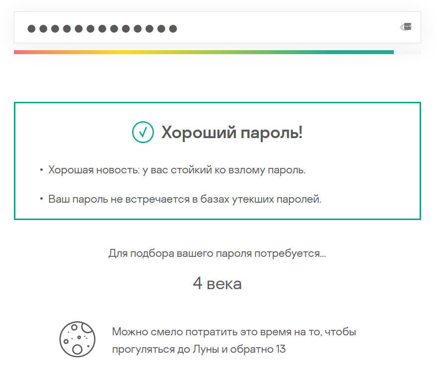 Кстати с помощью сервиса проверки сложности пароля от Каспера (!!!не реклама!!!) все указанные в посте пароли ломаются за время от 39 секунд до 2 месяцев. И лишь только Facetime2mom@sunday на столько сложен, что ломаться будет аж 17 лет.