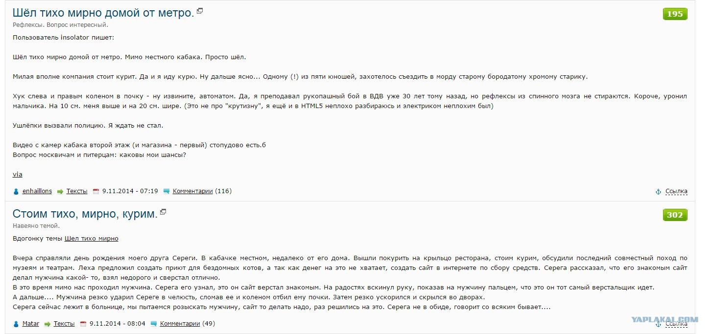 Говорил - как то иду за гаражами никого не трогаю двое и чуть сзади телка, первый борзый решил с подхода пиздануть ногой, товарищь делает резкий шаг на встечу, стопой в голень снял пинок и с ходу в голову -результат эпичен - ОЙ ДЯДЯ МЫ НИЧЕГО НЕ ХОТЕЛИ ... ,а ну ладно...