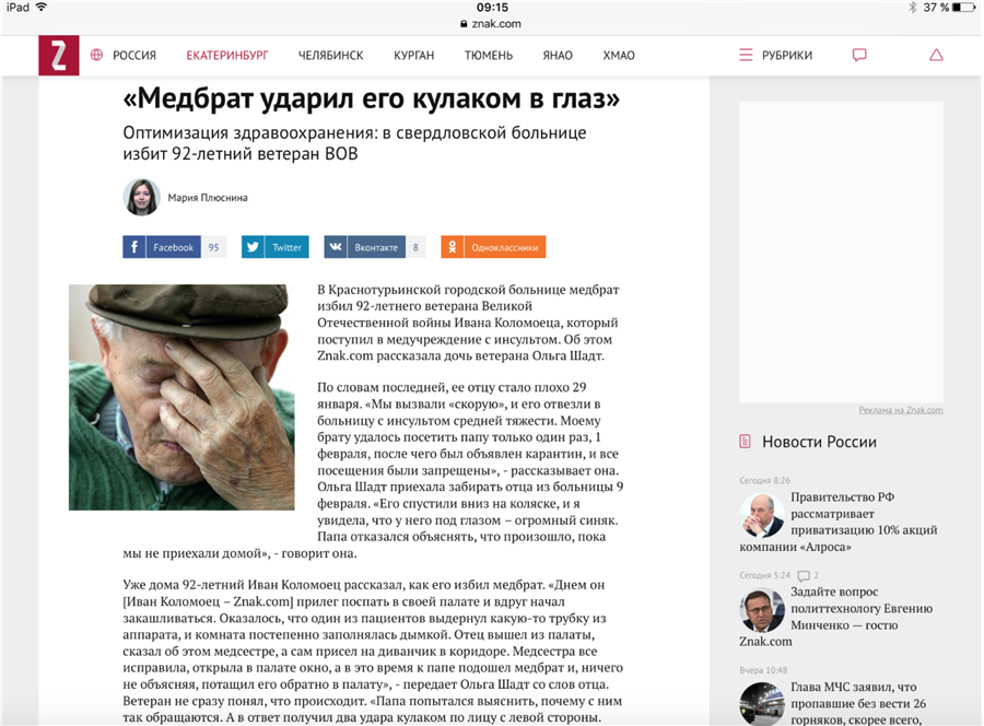 В Краснотурьинской городской больнице медбрат избил 92-летнего ветерана Великой Отечественной войны Ивана Коломоеца