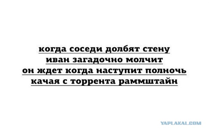 Смех смехом, а у меня соседи (в очень старом фонде, 200 лет дому), боковые, всей семьей в четыре разновозрастных рыла бухают круглосуточно. В основном, конечно, по ночам. Шум и мат при этом стоит, как на передовой во время боя. Периодически они друг дружке отвешивают пиздюлей, да так, что у меня на кухне тарелки в шкафу звенят. Ментов вызывали частенько, да без толку. Полицейские даже мне пригрозили штрафом за ложный вызов.