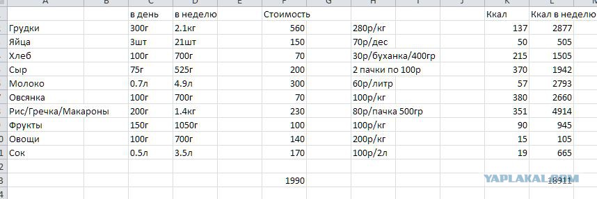 Около 2 гр. белка на кг, нормально по калориям и углям + бюджетно. Даже с указанием расходов в рублях)) Кто в теме может что подправят, но на мне работает. Пользуйся)