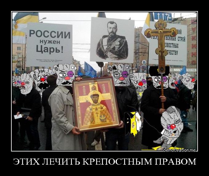 Вернуть имперскую символику: черно-желто-белый флаг, гимн «Боже, Царя храни!», установить орлов вместо звезд на башнях Кремля, побелить Кремль.