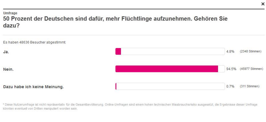 на вот этом немецком сайте был проведён опрос:"50% немцев за то, чтобы принимать больше беженцев. Относитесь ли вы к этим пятидесяти процентам?" как видно из картинки, проголосовало 48636 человек, из которых 94,5% ответили "нет".
