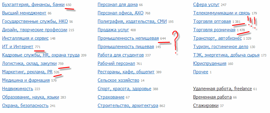 Вот как раз здесь ничего удивительного. В торговлю много вакансий объясняется политикой государства, где выгодно "купи-продай". Естественно, развивается соотв раздел экономики. Поражает другое. "Продажа услуг" явно обгоняет, к примеру, энергетику. Вот это плохо. Или туда предпочитают не набирать из Интернета? Потому как чревато...