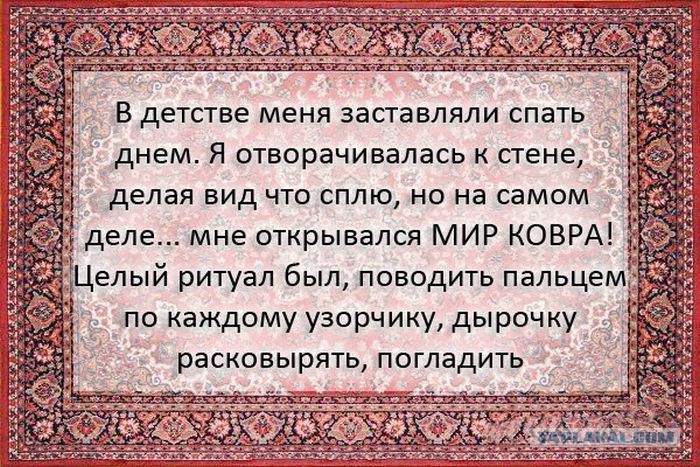Ковер наше все. До сих пор помню,что разглядывала,когда не могла уснуть. Там и драконы жили,и гномы,и человечки всякие. Мой сын уже лишен такого чудного мира ковра.
