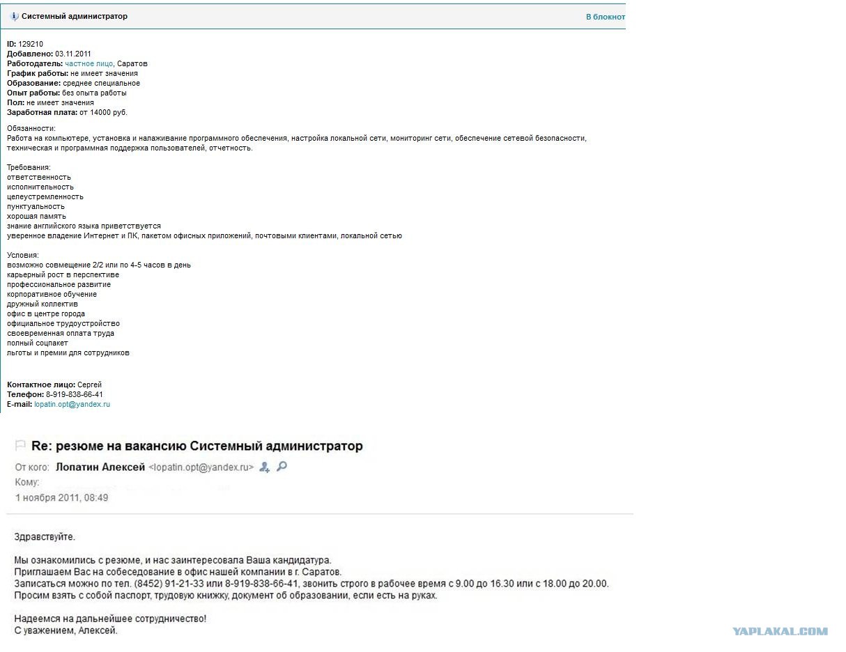 ....и мне "повезло" нарваться на такую организацию. На Саратовском сайте sarbc.ru я наткнулся на вакансию системного администратора и решил отправить резюме по адресу, указанному в объявлении.