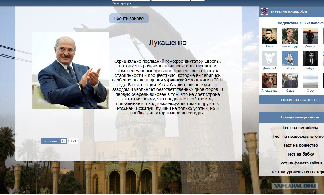 Официально последний гомофоб-диктатор Европы, потому что разгонял антиправительственные и гомосексуальные митинги. Привел свою страну к стабильности и процветанию, которые выделились особенно после падения украинской экономики в 2014 году. Батька нации. Как и Сталин, лично ездит по заводам и увольняет безответственных директоров. В первую очередь виновен в том, что не дает стране скатиться в яму, что предлагает чай гостям, прикалывается над гомосексуалистами и дружит с Россией. Пожалуй, лучший не только усатый, но и вообще диктатор в мире на сегодня.