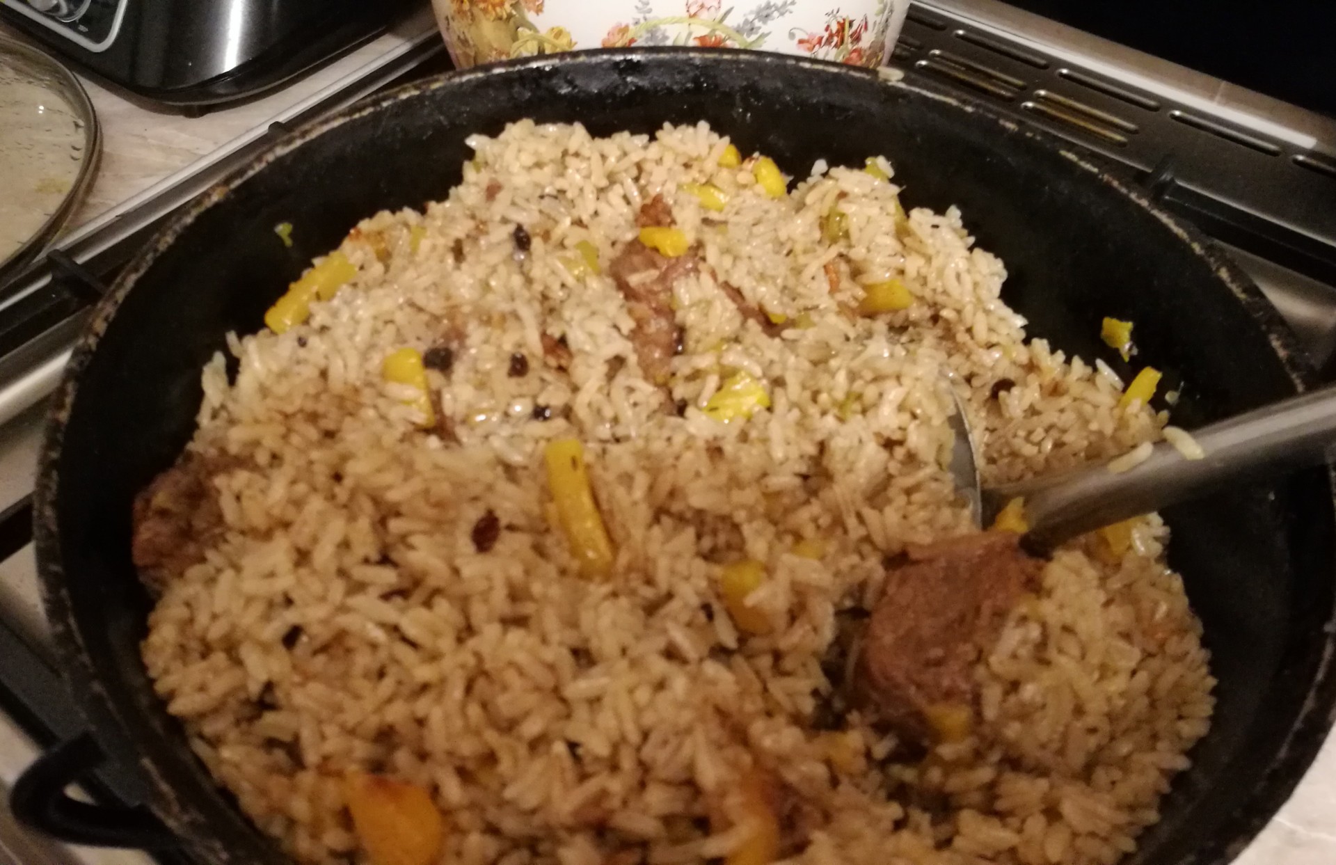 Сначала не поверил, но фотодоказательство есть как факт! Не поспоришь. (учитывая какие „гиганские“ порции еды готовят у нас). Просто в «Большой Плов“ баранина для любителей вкуса и по обычаю. А так в плов (человек так на 500-600) добавляют полтуши говядины (мякоть). Вот это плоффф....