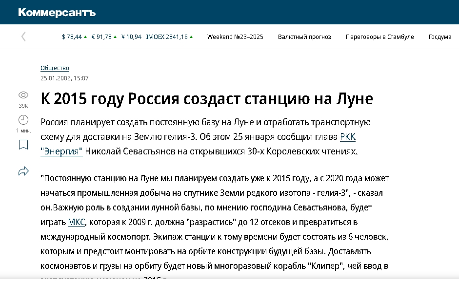 Россия планирует создать постоянную базу на Луне и отработать транспортную схему для доставки на Землю гелия-3. Об этом 25 января сообщил глава РКК "Энергия" Николай Севастьянов на открывшихся 30-х Королевских чтениях.