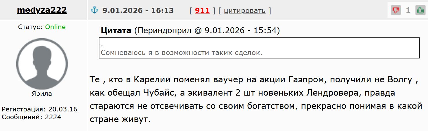 В Подмосковье на ваучер давали мало акций Газпрома. Отсюда и мой вполне корректный вопрос о количестве акций в Карелии. Его же ответ был хамским.