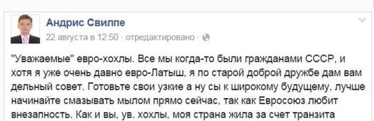 это вся ваша хохлятская сущность (ты можешь звать меня бульбашом я беларус) - передёргивать понятия и слова, я родился в ЛССР значит моя родина СССР и чё мне теперь на Урал надо ехать ? почему ? потому что ты жук на майдане скачешь ? так ты скачешь чтобы уехать а другая половина не хочет уезжать, но почему ты важней других тебе надо Родину нахуй растоптать на майдане а потом только ехать, почему ты не уедешь сразу ? я не понимаю, обьясни мне дураку, вот так же и в Латвии, латыши хорошо жить хотели вступили в ЕС, ахуели и сьебали в европы свои, остались мы, те кому ваш ЕС нахуй не нужен.