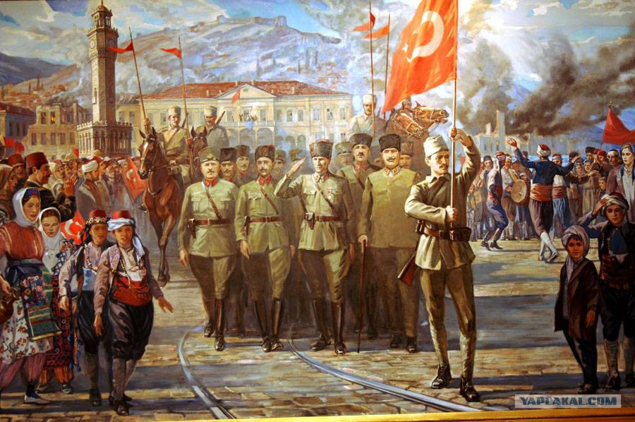 На заставке - краснознаменная турецкая армия во главе с Мустафой Кемалем (будущим Ататюрком) под радостные пляски местных жителей вступает в Смирну. Турецкая историко-пропагандистская картина.