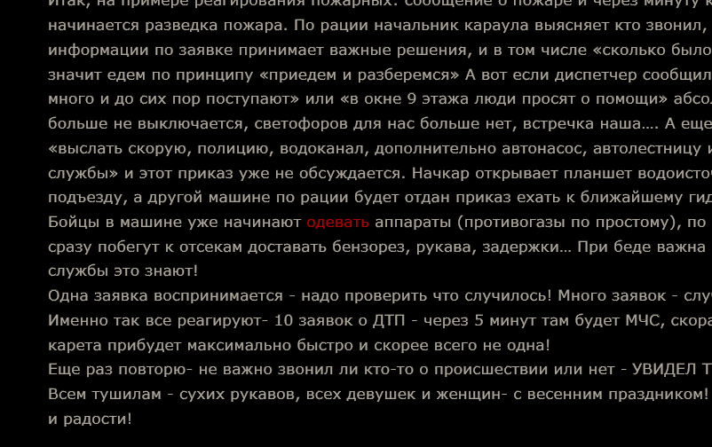 Итак, на примере реагирования пожарных: сообщение о пожаре и через минуту караул в пути. С этого момента начинается разведка пожара. По рации начальник караула выясняет кто звонил, что говорил и на основании информации по заявке принимает важные решения, и в том числе «сколько было заявок». Если заявка была одна - значит едем по принципу «приедем и разберемся» А вот если диспетчер сообщил волшебные фразы «заявок очень много и до сих пор поступают» или «в окне 9 этажа люди просят о помощи» абсолютно другая реакция- сирена больше не выключается, светофоров для нас больше нет, встречка наша…. А еще начкар отдает приказы диспетчеру «выслать скорую, полицию, водоканал, дополнительно автонасос, автолестницу и автомобиль газодымозащитной службы» и этот приказ уже не обсуждается. Начкар открывает планшет водоисточников и первая машина подъедет к подъезду, а другой машине по рации будет отдан приказ ехать к ближайшему гидранту и прокладывать магистраль. Бойцы в машине уже начинают одевать аппараты (противогазы по простому), по прибытию они не будут глазеть, а сразу побегут к отсекам доставать бензорез, рукава, задержки… При беде важна каждая секунда и все экстренные службы это знают!